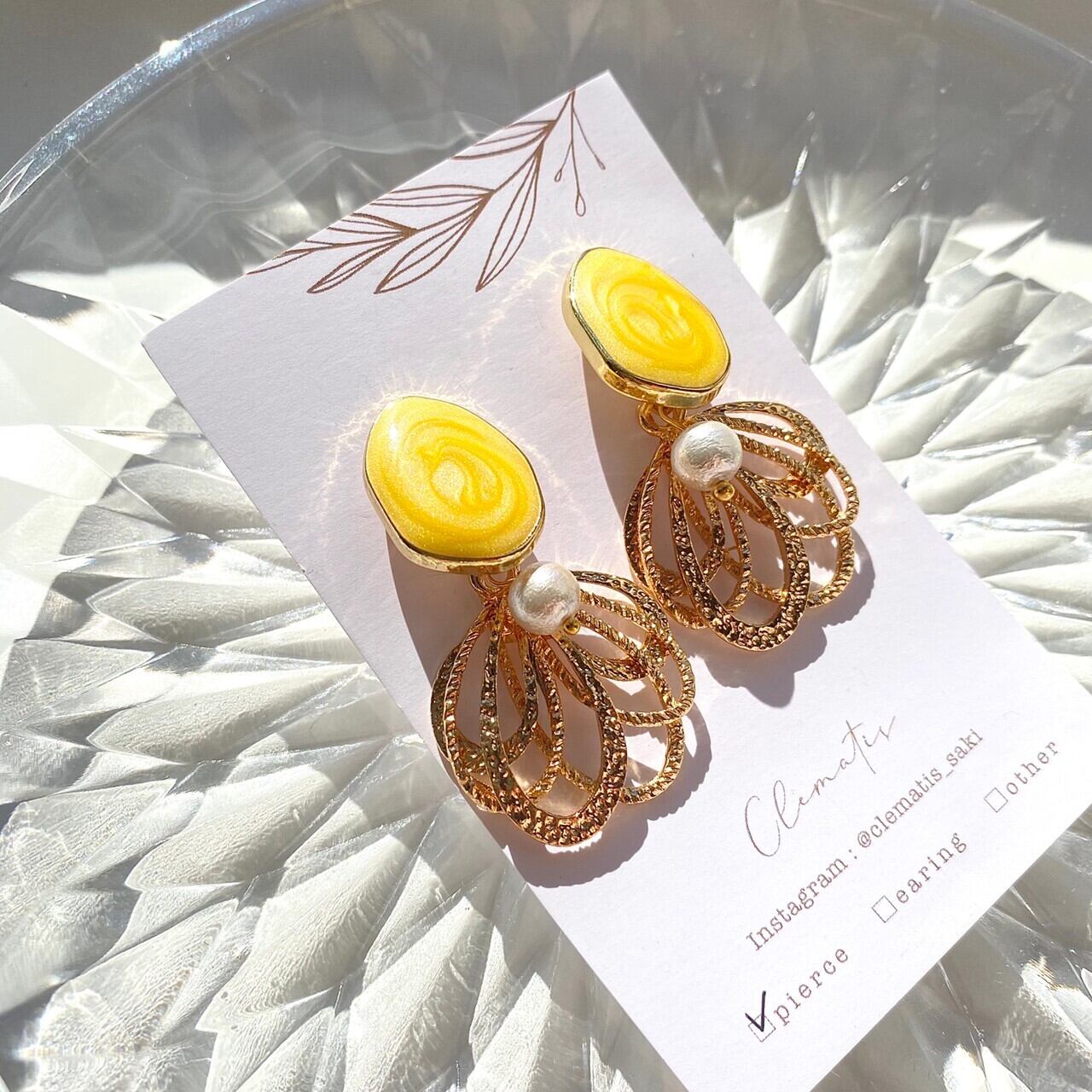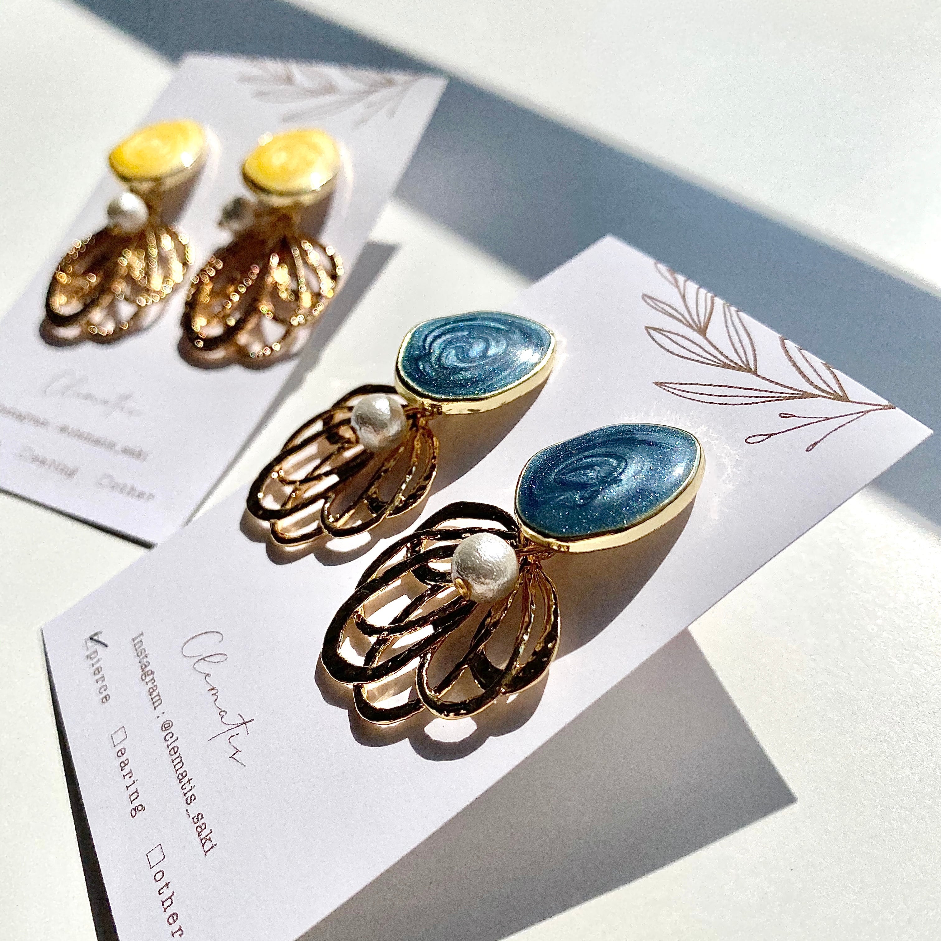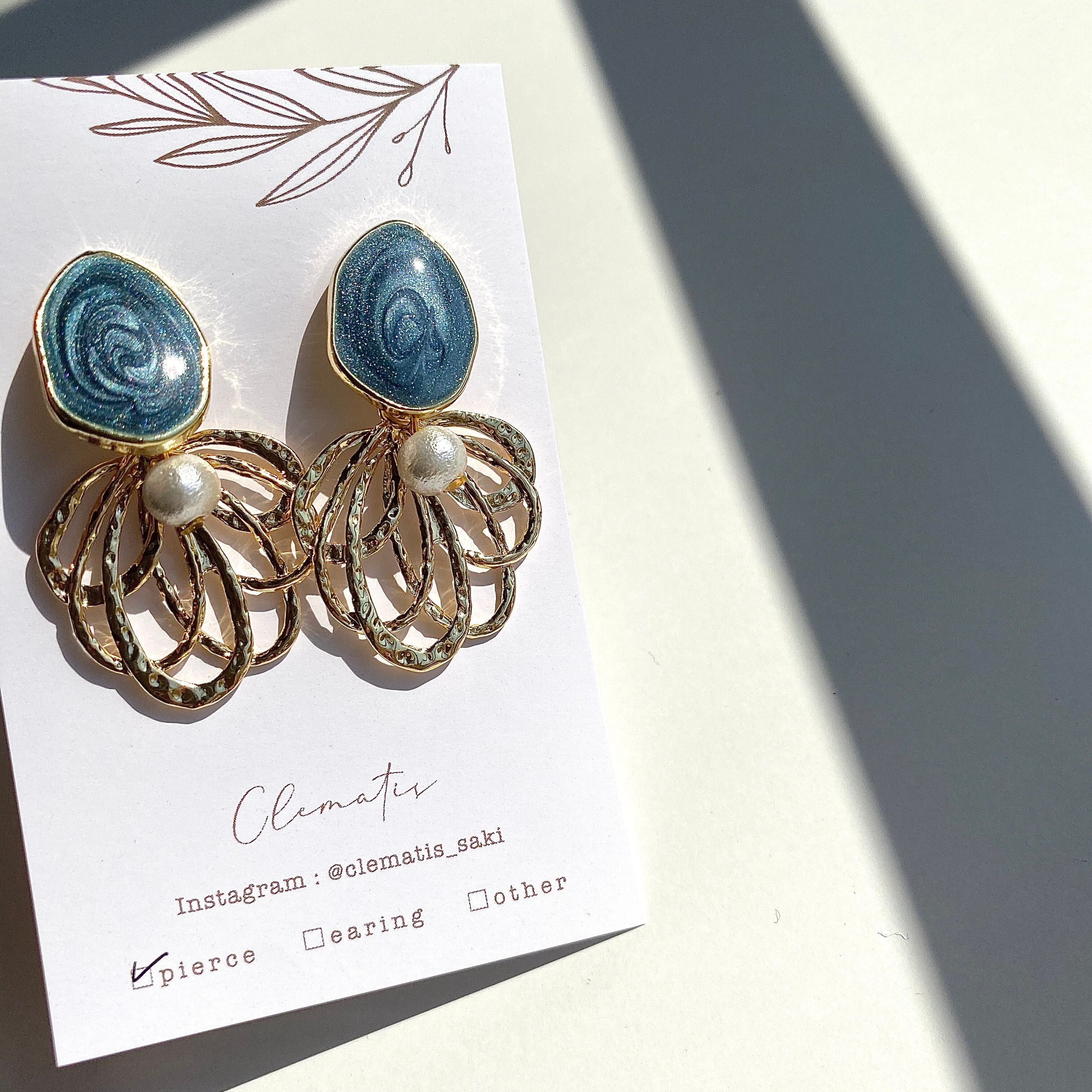 変形マーブルのポストに、小ぶりのコットンパールをあつらえました。