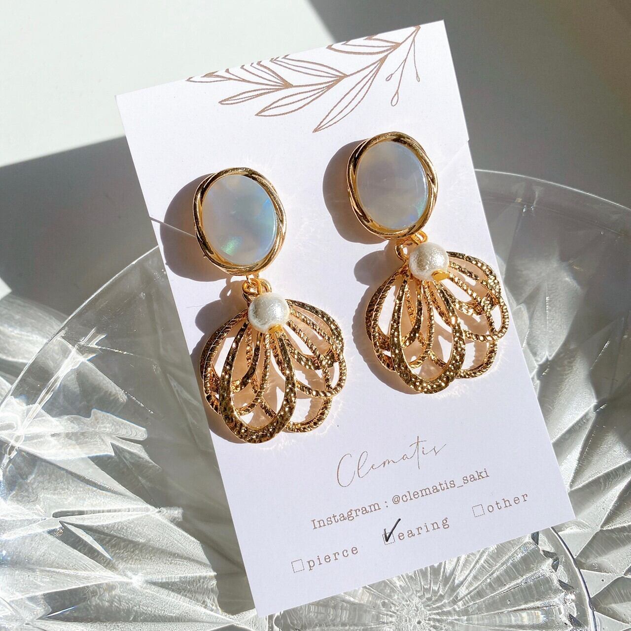 変形マーブルイヤリング✳︎ ◇D-1と同じ形のイヤリング 微妙な偏光パールが含まれた シェル風マーブルグレー。 上品なイヤリングです¨*•♫ フラワーシャワーにコットンパールがゆらゆら。 大人かわいいにこだわった作品です(^^) こちらはイヤリングのみのご用意となります。